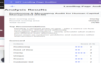 Аудитор целевых страниц GPT - это дополнение для Chrome, предназначенное для повышения эффективности целевых страниц с помощью анализа в реальном времени. Этот инструмент работает в боковой панели, позволяя пользователям проводить оценки позиционирования и сообщений без проблем во время просмотра. Его основное внимание сосредоточено на предоставлении аналитики, которая может помочь оптимизировать коэффициенты конверсии и улучшить взаимодействие с пользователями на основе контента, представленного на целевых страницах.